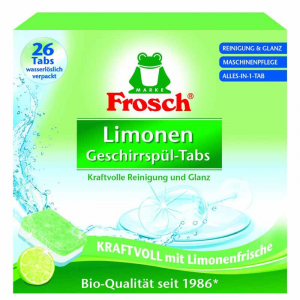 Tablete za perilicu posuđa Frosch s ekstraktom limete djeluje snažno u čišćenju posuđa i daje posuđu i staklenim predmetima briljantni sjaj. Formula sve-u-jednom za sigurnost hrane koja se temelji na obnovljivim sirovinama nudi sljedeće: ČIŠĆENJE: otapa suhe ostatke hrane i tvrdokorne mrlje od čaja s prirodnom sodom POMOĆ ZA ISPIRANJE: blistav sjaj bez kapi vode SOL: pouzdano sprječava nakupljanje kamenca ZAŠTITA STAKLA: sprječava zamagljivanje stakla i održava transparentnost i sjaj INOX SJAJ: blistav sjaj bez poliranja OSTACI HRANE: otapa tvrdokorne nakupine koje ostavlja mljeveno meso, zobena kaša, jaje, mlijeko